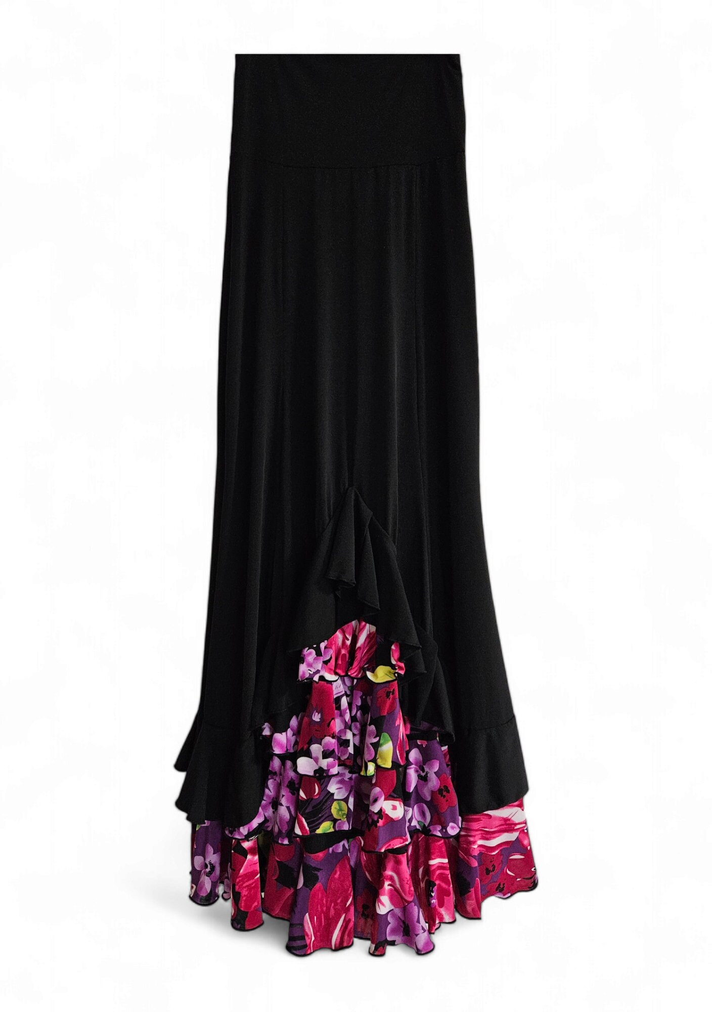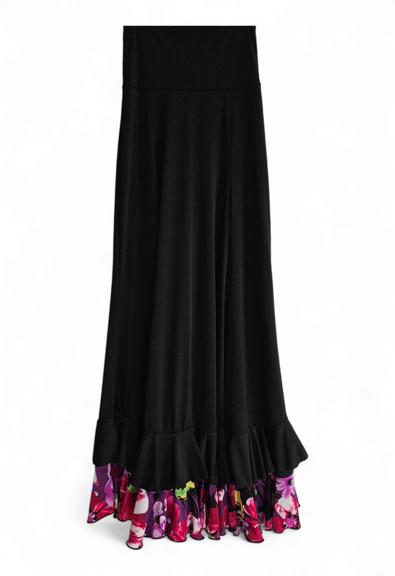 This listing is for a Beautiful flamenco skirt , made all with a very soft and comfortable stretch fabric in black with floral print polyester,A line ,very flattering , choose your size, ideal for your classes or recitals ,fold over waistband will make it adaptable to your height (no zipper) also this stretch fabric makes the skirt adaptable to different sizes and body shapes .