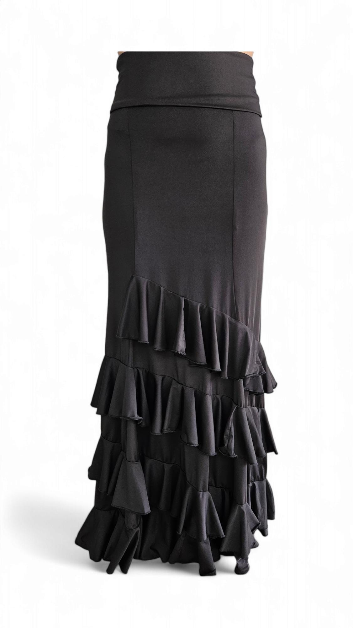 This listing is for a Beautiful flamenco skirt , made all with a very soft and comfortable stretch fabric in black ,A line ,very flattering , choose your size, ideal for your classes or recitals ,fold over waistband will make it adaptable to your height (no zipper) also this stretch fabric makes the skirt adaptable to different sizes and body shapes .